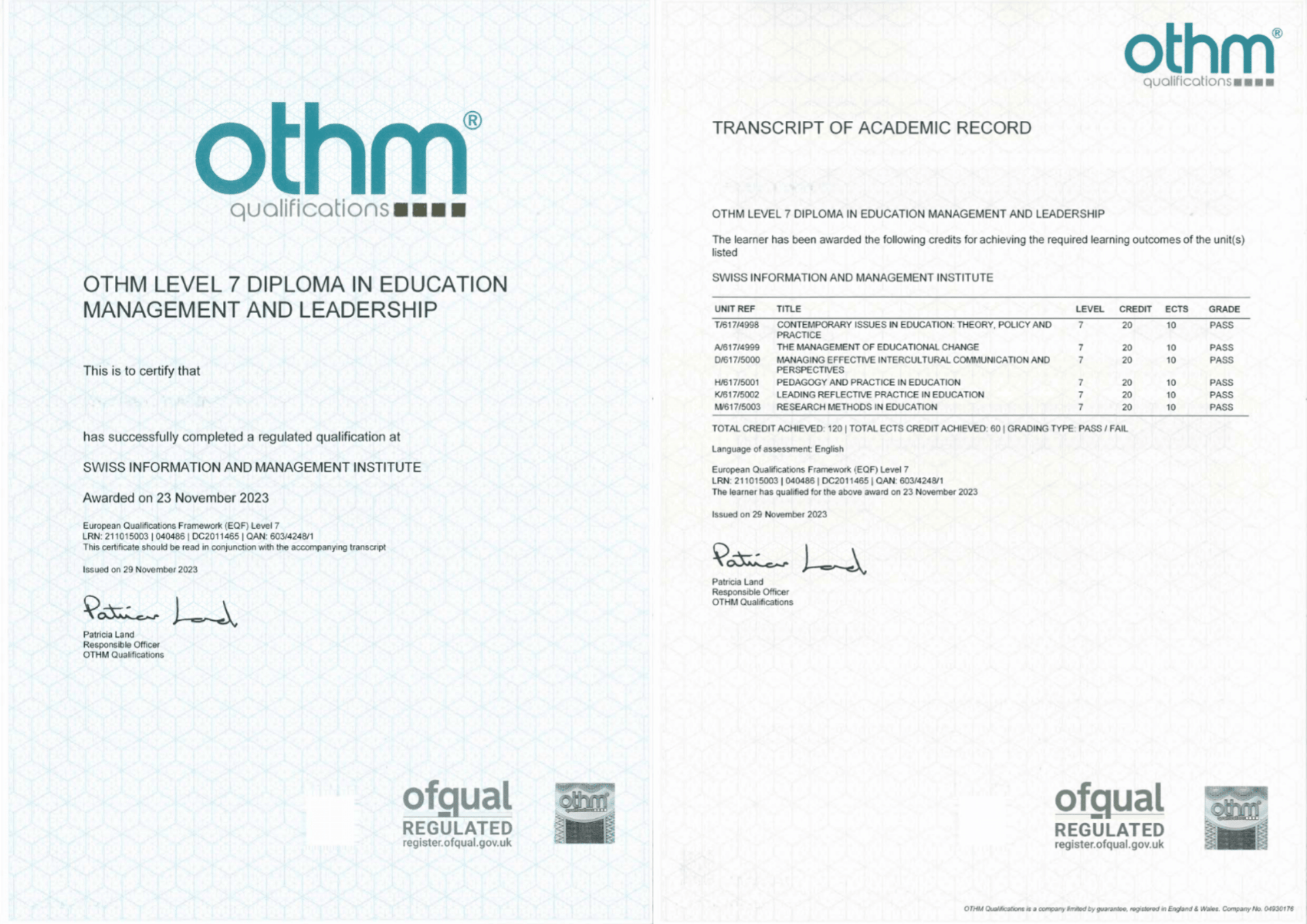 - Sample Qualification - Transcript of OTHM Level 7 Diploma in Education Management and Leadership: CLICK HERE